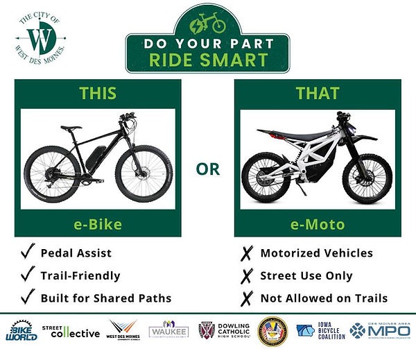 This week I’d like to share some perspectives from the other side of the river at bikeiowa.com, and from Street Collective in Des Moines. All locales seem to be grappling with the same issues these days. How do we promote legal use of e-bikes while discouraging e-motos? Sure, they’re capable of riding under 20 mph on trails, but is that what we often see them doing? Rather than trying to er, re-invent the wheel, I’m posting what bikeiowa has to say on the subject: